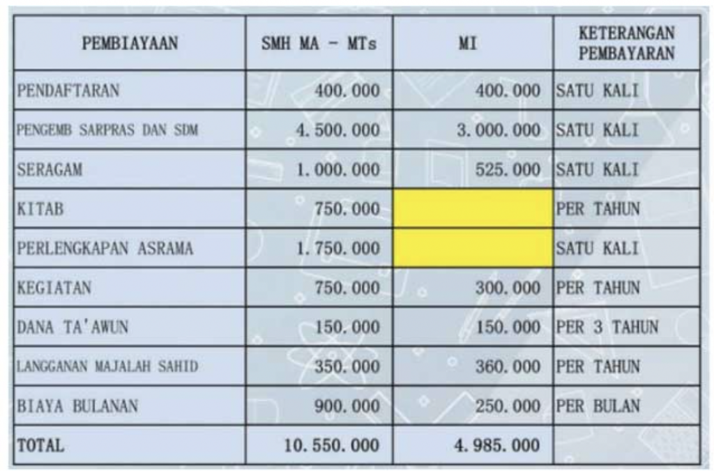 Biaya pendaftaran di pondok pesantren Hidayatullah telah ditetapkan sebesar Rp 400.000, sedangkan biaya masuk untuk tingkat MTs sekitar Rp 10 juta dan untuk tingkat MI sekitar Rp 5 juta. Biaya tersebut mencakup pengembangan sarana dan prasarana dengan jumlah Rp 4.500.000 untuk MTs dan Rp 3.000.000 untuk MI. Untuk informasi lebih lanjut, berikut adalah tabel yang dapat kita lihat bersama.