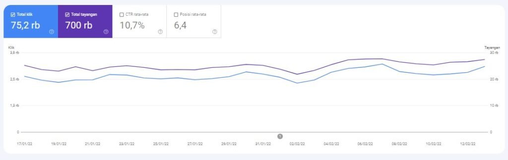 Setiap hari, kami dikunjungi sekitar 3 ribu pembaca, baik dari dalam maupun luar negeri. Per-Februari 2022, data kunjungan organik Google menuju website kami sebagai berikut: