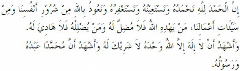 ﺇِﻥَّ ﺍﻟْﺤَﻤْﺪَ ﻟِﻠﻪِ ﻧَﺤْﻤَﺪُﻩُ ﻭَﻧَﺴْﺘَﻌِﻴْﻨُﻪُ ﻭَﻧَﺴْﺘَﻐْﻔِﺮُﻩْ ﻭَﻧَﻌُﻮﺫُ ﺑِﺎﻟﻠﻪِ ﻣِﻦْ ﺷُﺮُﻭْﺭِ ﺃَﻧْﻔُﺴِﻨَﺎ ﻭَﻣِﻦْ ﺳَﻴِّﺌَﺎﺕِ ﺃَﻋْﻤَﺎﻟِﻨَﺎ، ﻣَﻦْ ﻳَﻬْﺪِﻩِ ﺍﻟﻠﻪُ ﻓَﻼَ ﻣُﻀِﻞَّ ﻟَﻪُ ﻭَﻣَﻦْ ﻳُﻀْﻠِﻞْ ﻓَﻼَ ﻫَﺎﺩِﻱَ ﻟَﻪُ. ﺃَﺷْﻬَﺪُ ﺃَﻥَّ ﻻَ ﺇِﻟَﻪَ ﺇِﻻَّ ﺍﻟﻠﻪ ﻭَﺃَﺷْﻬَﺪُ ﺃَﻥَّ ﻣُﺤَﻤَّﺪًﺍ ﻋَﺒْﺪُﻩُ ﻭَﺭَﺳُﻮْﻟُﻪُ
