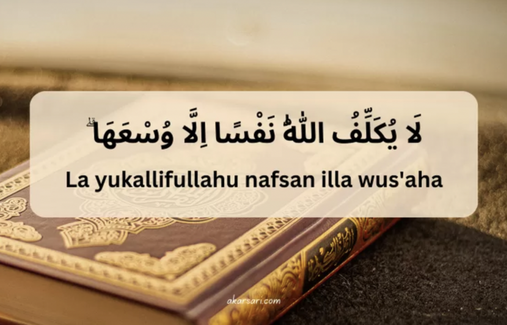 Latin: “Laa Yukallifullahu Nafsan Illa Wus’aha”