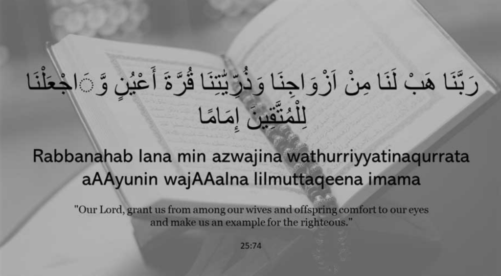 رَبَّنَا هَبْ لَنَا مِنْ أَزْوَاجِنَا وَذُرِّيَّاتِنَا قُرَّةَ أَعْيُنٍ وَاجْعَلْنَا لِلْمُتَّقِينَ إِمَامًا